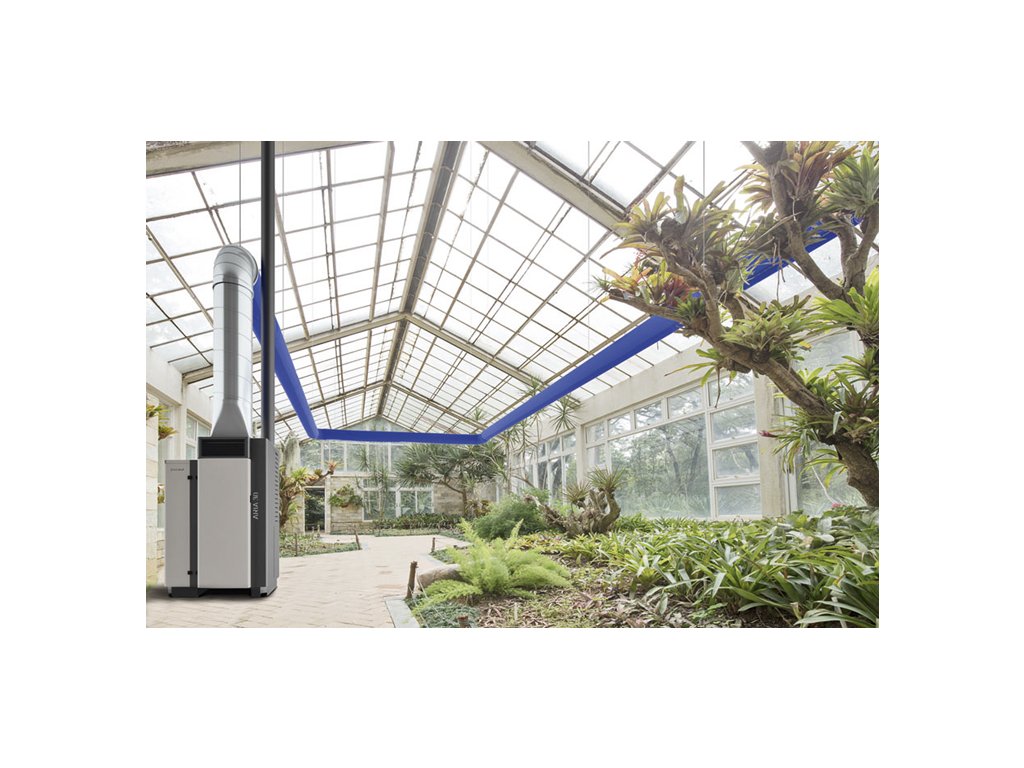 - K dispozici jsou nastavitelné vývody horkého vzduchu (např. Ø 20 cm), což zajišťuje flexibilní směrování tepla.
